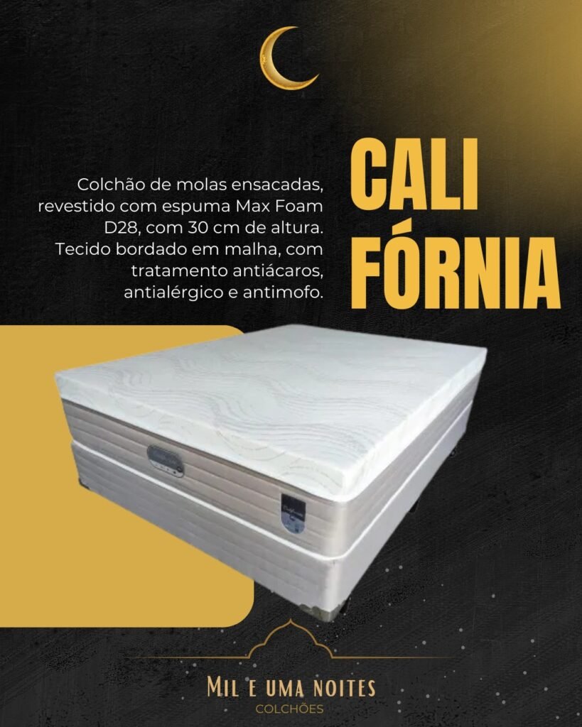Conheça o Colchão Califórnia, um colchão de molas ensacadas, revestido com espuma Max Foam D28, com 30cm de altura. Tecido bordado em malha, com tratamento antiácaros, antialérgico e antimofo.