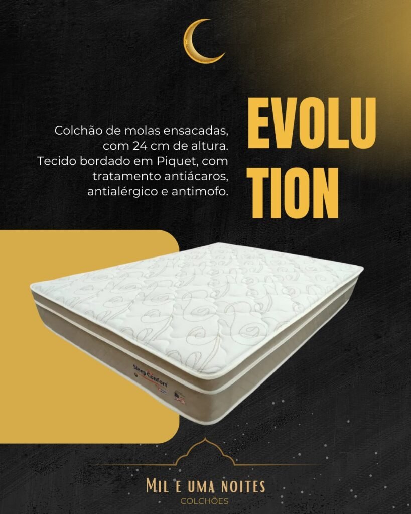 Conheça o Colchão Evolution, um colchão de molas ensacadas, com 24cm de altura. Tecido bordado em Piquet, com tratamento antiácaros, antialérgico e antimofo.