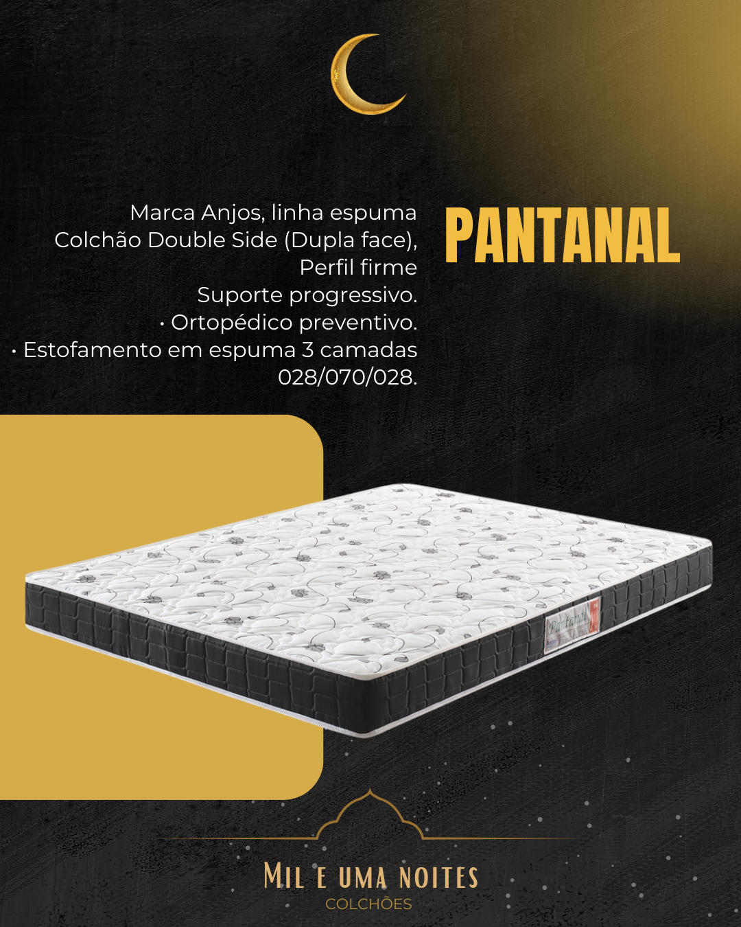 Conheça o Colchão Pantanal, um colchão da marca Anjos, linha espuma. Colchão Double Side (Dupla face), perfil firme, suporte progressivo, ortopédico preventivo, estofamento em espuma 3 camadas 028/070/028.