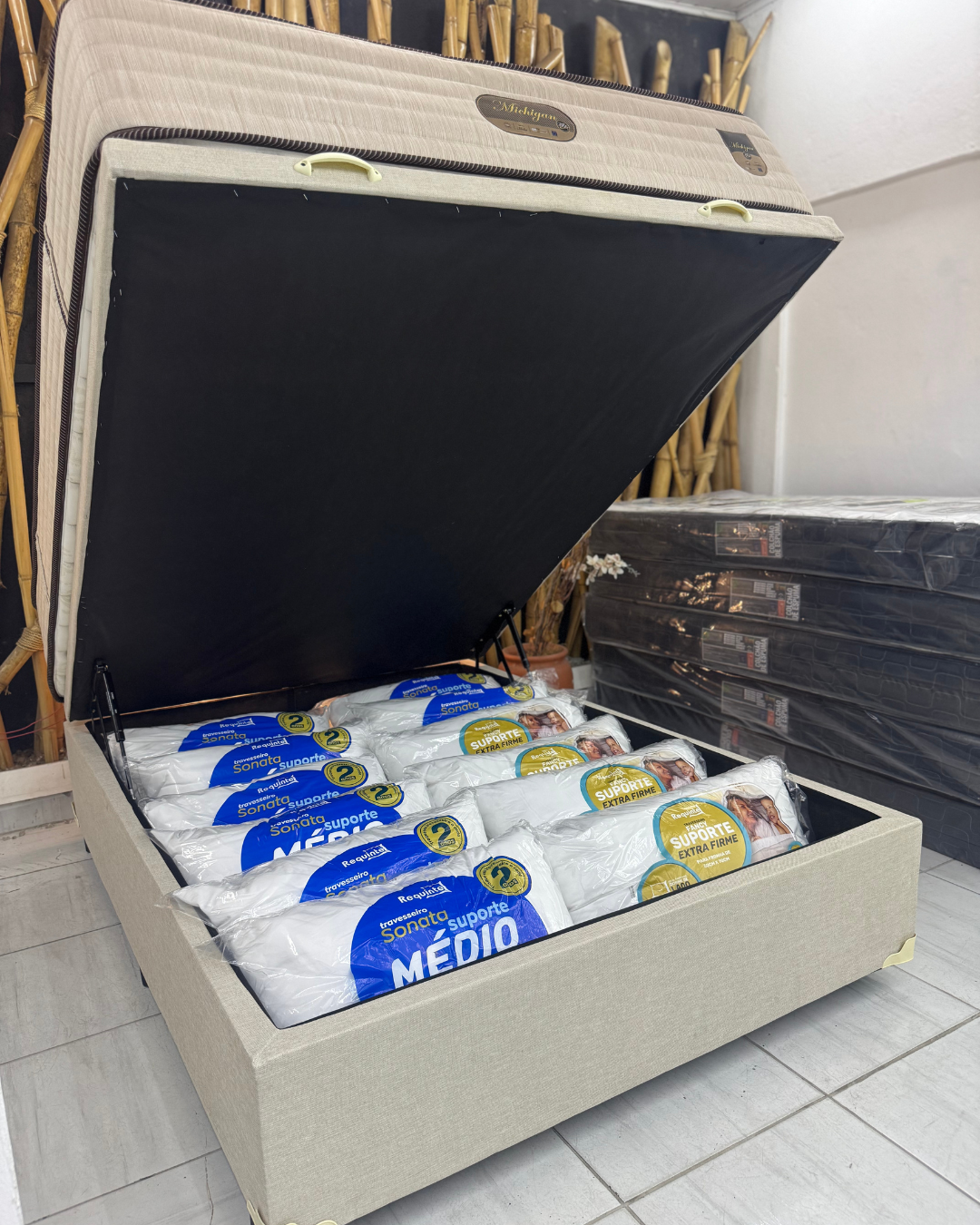 Cama Baú produzida em madeira de alta resistência, com revestimento em tecido respirável e tratamento antiácaros. Conta com sistema de abertura por pistões a gás e amplo espaço interno para organização, unindo durabilidade, praticidade e conforto.